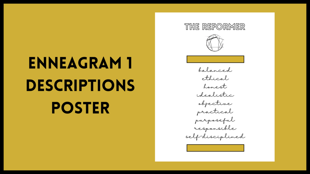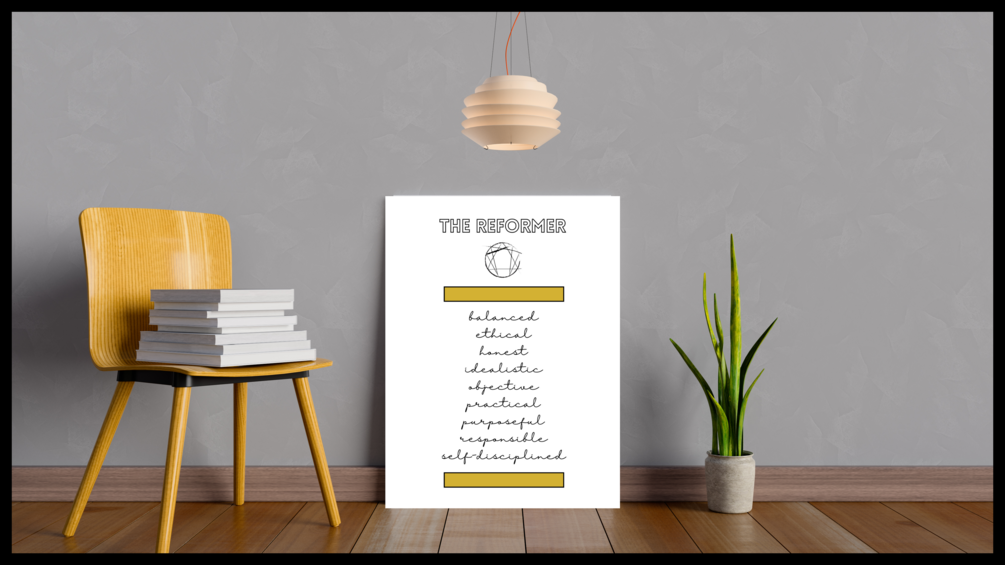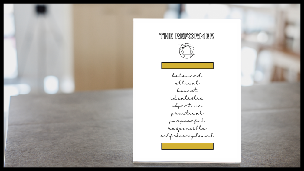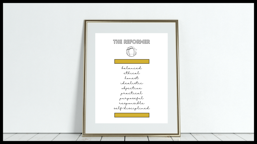 This item features The Reformer written in block letters above a paintbrush-design figure of the Enneagram. Underneath are nine adjectives written in a cursive font which describe Type One: