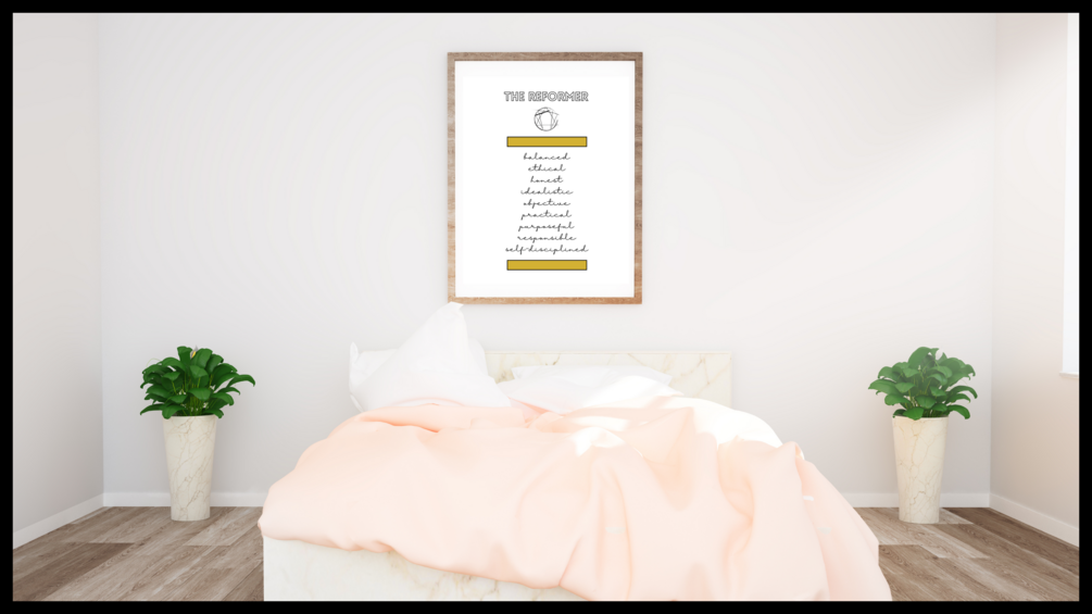 The black and white of the print are accented with two yellow bars reflecting the personality of The Reformer.