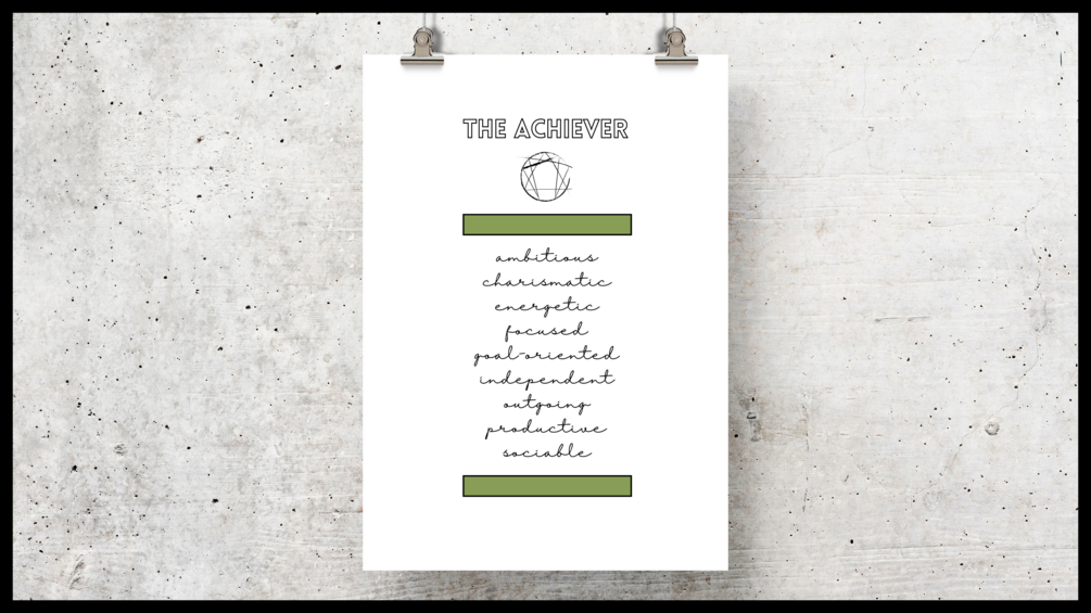 The black and white of the print are accented with two green bars reflecting the personality of The Achiever.