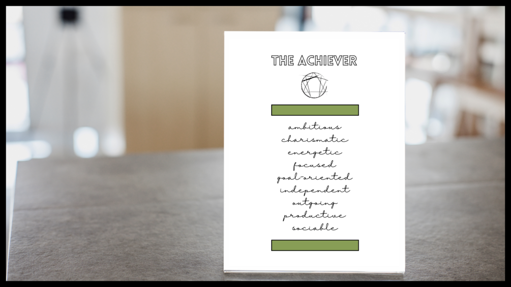 This item features The Achiever written in block letters above a paintbrush-design figure of the Enneagram. Underneath are nine adjectives written in a cursive font which describe Type Three:
