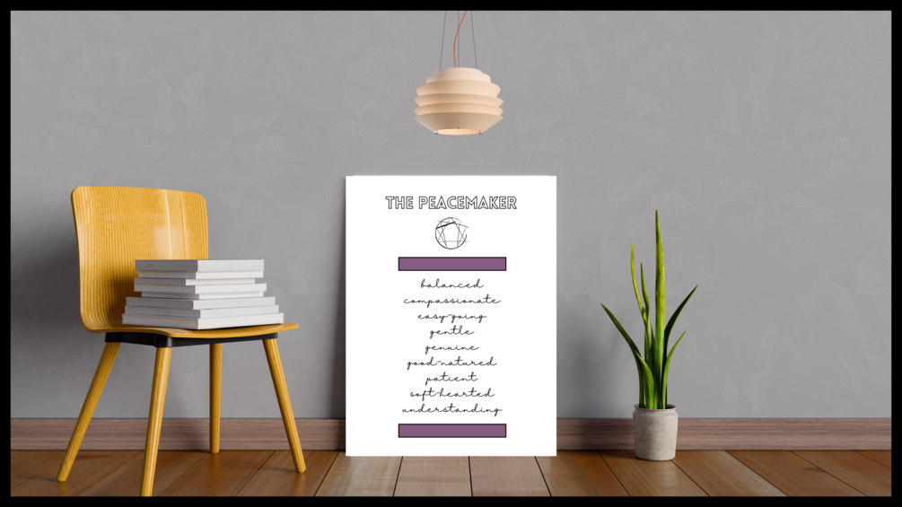 This item features The Peacemaker written in block letters above a paintbrush-design figure of the Enneagram. Underneath are nine adjectives written in a cursive font which describe Type Nine: